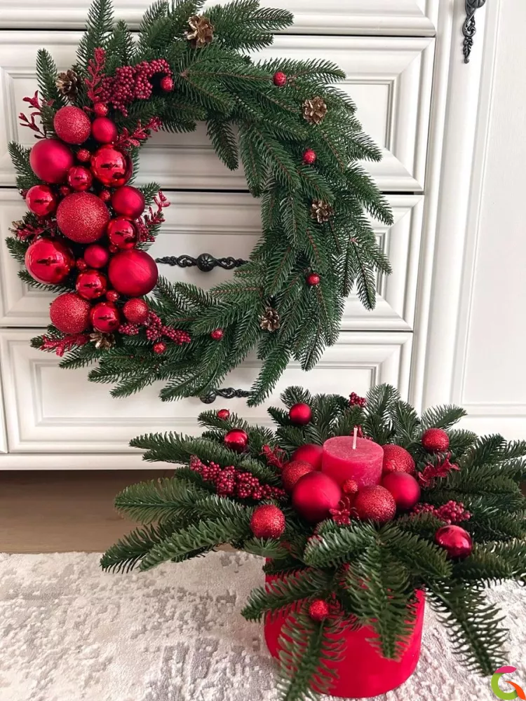 вам наш фирменный новогодний декор из свежих ёлочных веток и уникальных