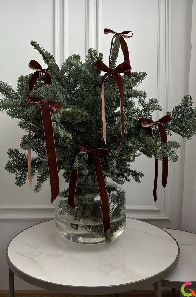 вам наш фирменный новогодний декор из свежих ёлочных веток и уникальных