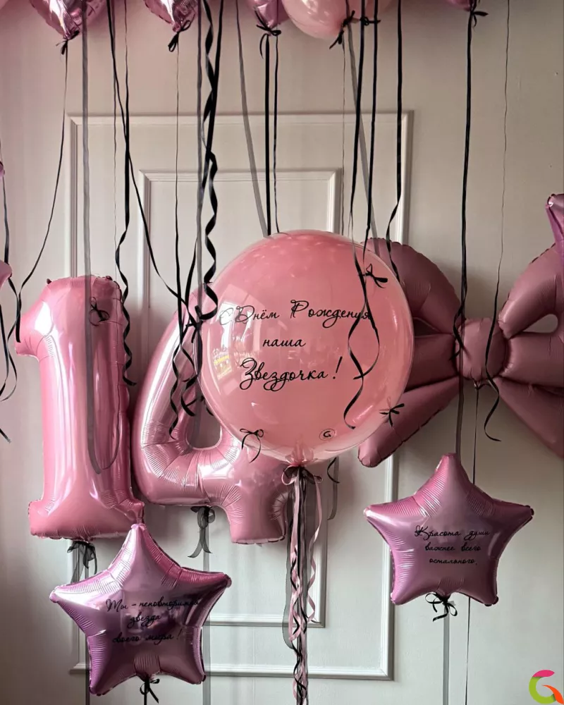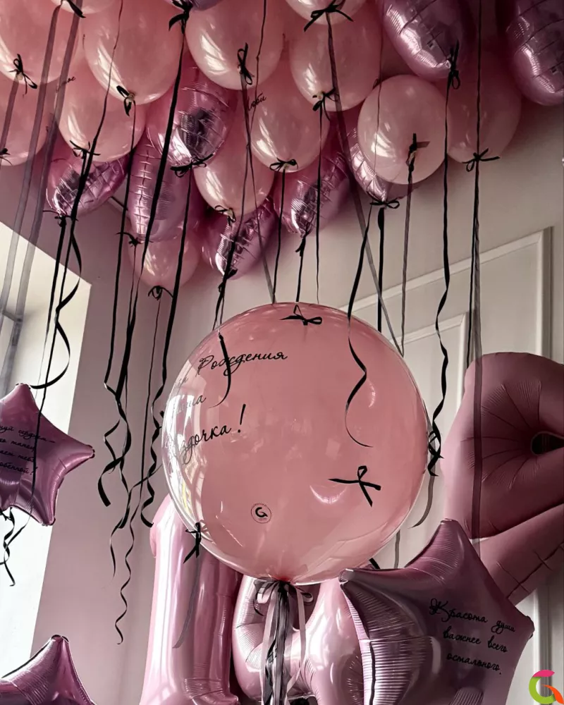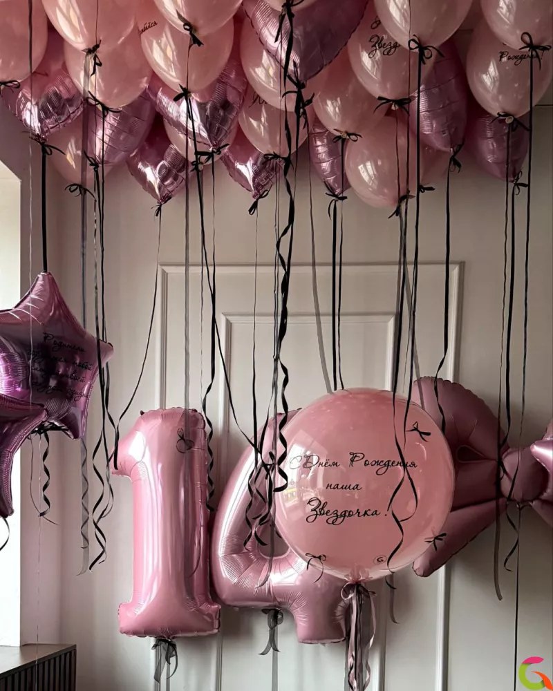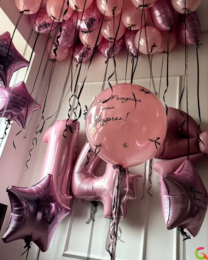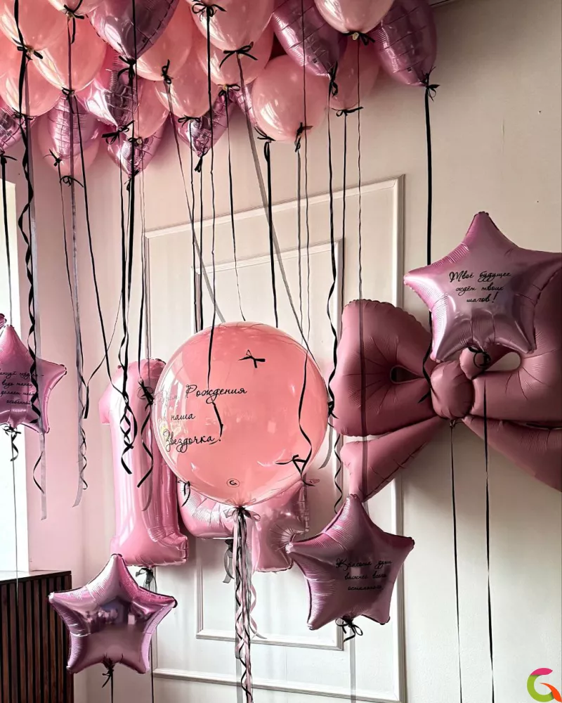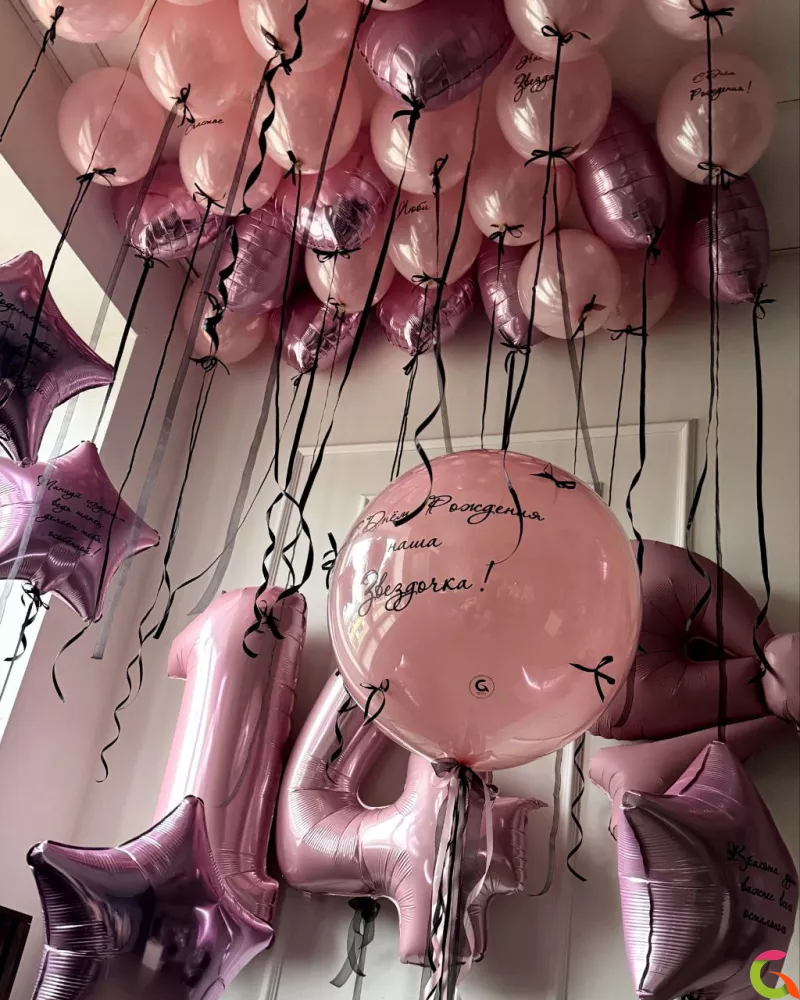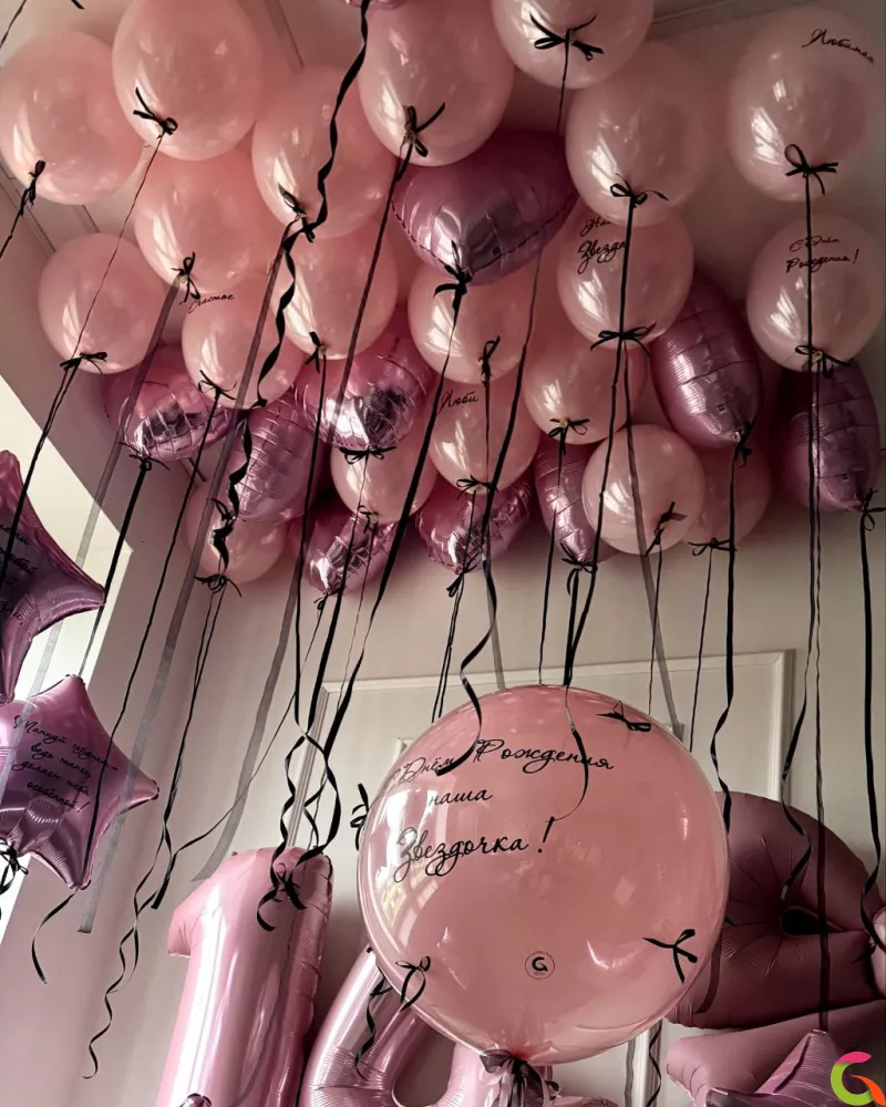 - Шары розовые 12’ двойные с индивидуальными надписями и лентами - 10 шт;
